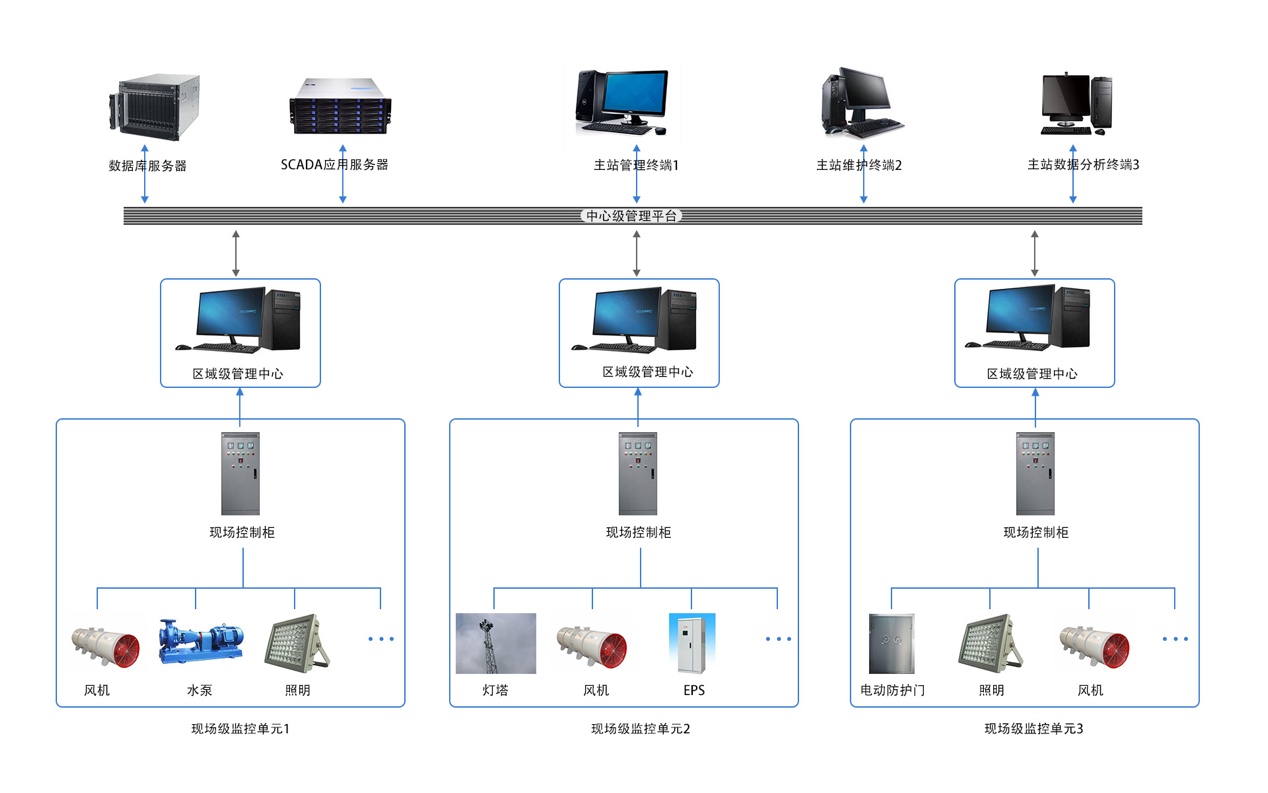 公共防災(zāi)救援設(shè)備監(jiān)控系統(tǒng)采用多層分級結(jié)構(gòu),自上而下劃分為中心級管理平臺、區(qū)域級管理中心和現(xiàn)場級監(jiān)控單元。其中現(xiàn)場級監(jiān)控單元包括水泵,風(fēng)機,照明,電動防護門,燈塔,EPS等現(xiàn)場設(shè)備以及負責現(xiàn)場設(shè)備監(jiān)控的現(xiàn)場控制柜。