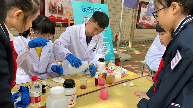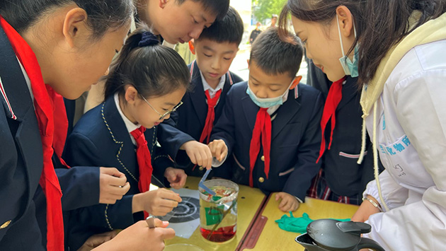 來自羰基合成與選擇氧化國家重點(diǎn)實(shí)驗(yàn)室、中國科學(xué)院西北特色植物資源化學(xué)重點(diǎn)實(shí)驗(yàn)室、先進(jìn)潤滑與防護(hù)材料研究發(fā)展中心、環(huán)境材料與生態(tài)化學(xué)研究發(fā)展中心的8名研究生,開展了“水母燈塔”“大象牙膏”“看我七十二變”“水下花園”等4組實(shí)驗(yàn)?;顒?dòng)中,科普實(shí)驗(yàn)員們帶領(lǐng)學(xué)生們學(xué)習(xí)了簡單實(shí)用的科學(xué)知識(shí),展示了精彩有趣的科學(xué)實(shí)驗(yàn),引導(dǎo)學(xué)生們自主動(dòng)手感受科學(xué)實(shí)驗(yàn)的快樂。小實(shí)驗(yàn)蘊(yùn)含大智慧,科學(xué)實(shí)驗(yàn)的神奇魔力讓同學(xué)們目不轉(zhuǎn)睛。