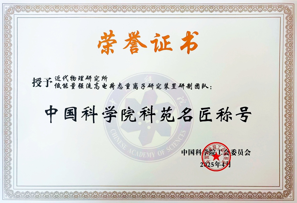 近代物理所低能量強流高電荷態(tài)重離子研究裝置研制團(tuán)隊榮獲中國科學(xué)院第六屆“科苑名匠”稱號