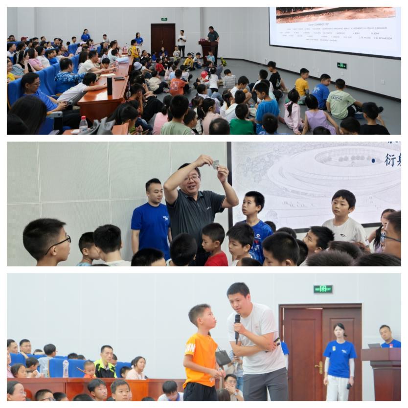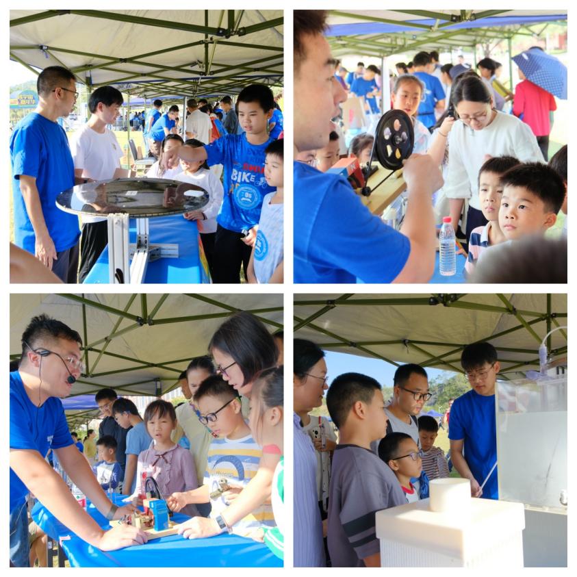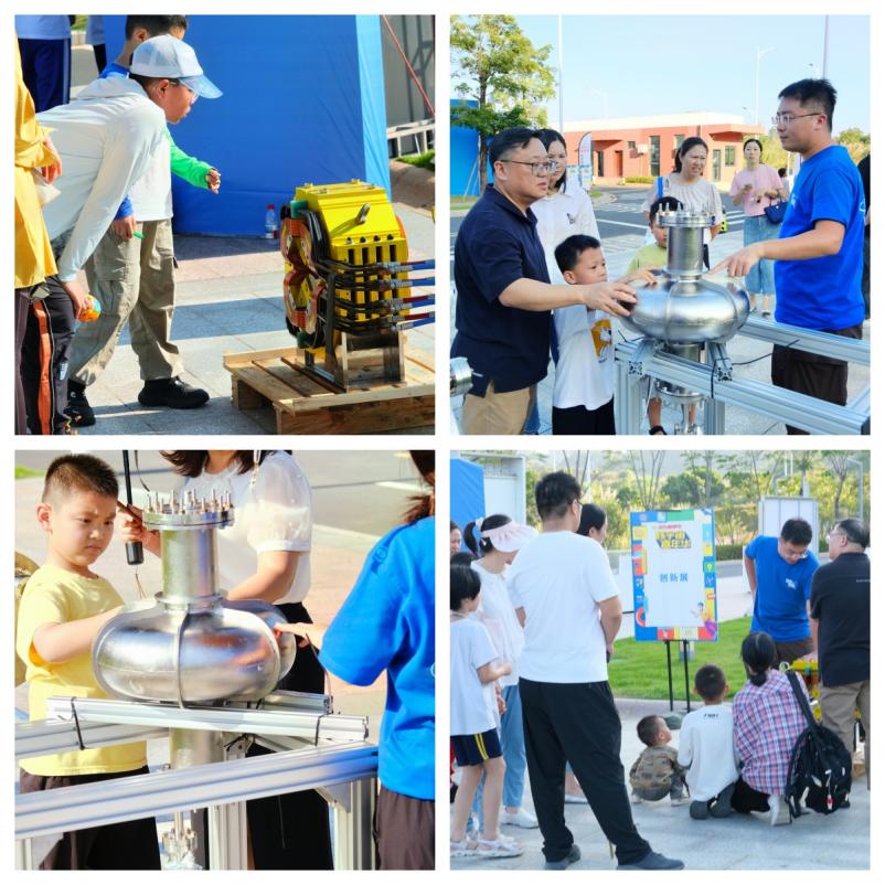 活動形式豐富多樣,科普展廳設(shè)有強流重離子加速器裝置(HIAF)和加速器驅(qū)動嬗變研究裝置(CiADS)的沙盤模型,科研人員為現(xiàn)場公眾詳細(xì)講解這些國家重大科技基礎(chǔ)設(shè)施的進展。在創(chuàng)新展區(qū),展示了超緊湊旋轉(zhuǎn)束重離子治療系統(tǒng)和中國首臺碳離子治療系統(tǒng)等模型,四極磁鐵、超導(dǎo)腔等加速器實物設(shè)備也吸引了不少關(guān)注??破請蟾姝h(huán)節(jié)中,中國科學(xué)技術(shù)大學(xué)的謝治助理研究員作了題為《追光逐日,迎接未來》的報告,介紹同步輻射領(lǐng)域的前沿知識;中國科學(xué)院近代物理研究所的藍(lán)江山副研究員則以《探索微觀物質(zhì)世界的奧秘》為題,帶領(lǐng)聽眾探索粒子物理的奧秘,現(xiàn)場引發(fā)了熱烈提問?;芋w驗是本次活動的亮點。在實驗秀中,展示了高溫超導(dǎo)磁懸浮和核孔膜超黑材料等實驗演示;在“粒子特工訓(xùn)練基地”,孩子們通過游戲模擬重離子在加速器中的運動,深入理解其工作原理,特邀惠州學(xué)院附屬學(xué)校學(xué)生擔(dān)任該項活動特別講解員,通過。此外,創(chuàng)工坊里,孩子們在老師的指導(dǎo)下參與科學(xué)制作,激發(fā)了他們對科學(xué)的熱情。