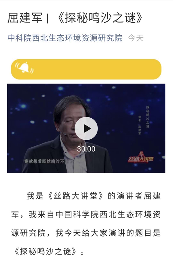 在西北研究院微信公眾號推送了屈建軍研究員主講的《探秘鳴沙之謎》科普報告,報告講述了其研究團隊通過長年的科學研究,發(fā)現(xiàn)自然沙粒表面的多孔(坑)狀結(jié)構(gòu)所構(gòu)成的共鳴腔,是鳴沙發(fā)聲的關鍵所在。就像掏耳朵一樣,把堵在孔洞里的臟東西洗干凈,鳴沙就“復聲”了,實現(xiàn)了鳴沙的修復,成功復活了鳴沙自然現(xiàn)象,讓失聲的沙子再“唱歌”。