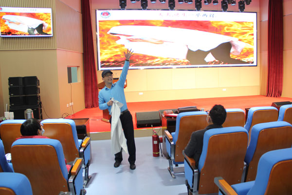 王尚華從構筑社會消防安全“防火墻”工程提出的消防“三懂三提示四個能力”建設入手開展了消防安全講授?!叭奔炊馂念A防知識,懂單位防火的措施,懂撲救火災的方法?!叭崾尽保忍崾竟娝趫鏊馂奈kU性,提示公眾所在場所安全逃生路線、安全出口的具體位置、遇到火災等緊急情況如何正確逃生、自救,提示公眾所在場所內(nèi)滅火器、逃生設備器材具體放置位置和使用方法。“四個能力”,即檢查和整改火災隱患能力,撲救初期火災能力,組織引導人員疏散逃生能力,消防安全知識宣傳教育培訓能力。王尚華用幽默風趣的語言,結(jié)合大量的現(xiàn)實案例,給大家上了一堂生動活潑的安全教育課,深受參會職工和學生的歡迎。