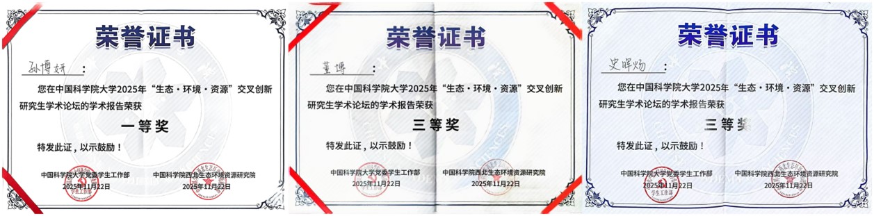 論壇設(shè)置“生態(tài)與環(huán)境領(lǐng)域組”“資源與工程領(lǐng)域組”及“弘揚科學(xué)家精神與研究生思政教育管理研討組”三大專題板塊,聚焦國家戰(zhàn)略需求與科技前沿,推動學(xué)科融合與協(xié)同創(chuàng)新。青海鹽湖所研究生緊扣青藏高原生態(tài)安全屏障、柴達(dá)木盆地資源高效利用與環(huán)境保護(hù)等關(guān)鍵科學(xué)問題等多個方向進(jìn)行學(xué)術(shù)報告和墻報展示?,F(xiàn)場討論熱烈,學(xué)術(shù)氛圍濃厚。通過這一高水平平臺,青海鹽湖所研究生不僅展示了最新的科研進(jìn)展,更與兄弟院所建立了深入的學(xué)術(shù)聯(lián)系,為后續(xù)合作奠定了良好基礎(chǔ)。參會研究生們憑借出色表現(xiàn),成績斐然。孫博妍榮獲優(yōu)秀學(xué)術(shù)報告一等獎;董博與史暉煬榮獲優(yōu)秀學(xué)術(shù)報告三等獎;馬智超、甄璐菲、盧文薇的墻報榮獲優(yōu)秀墻報獎。